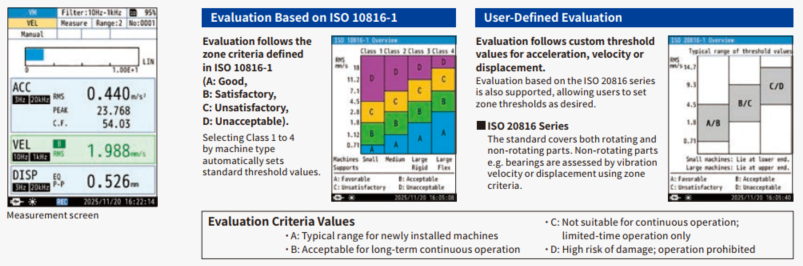 VX-14D posiada funkcję oceny absolutnej poziomu drgań, zgodną z normą ISO 10816-1. Zmierzone wartości drgań porównywane są automatycznie z progami normatywnymi, a stan maszyny klasyfikowany jest do jednej z czterech stref: