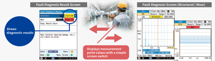 VX-14D umożliwia automatyczną ocenę kondycji maszyn na podstawie pomiarów drgań, wspierając działy utrzymania ruchu w przejściu z utrzymania reaktywnego na predykcyjne.